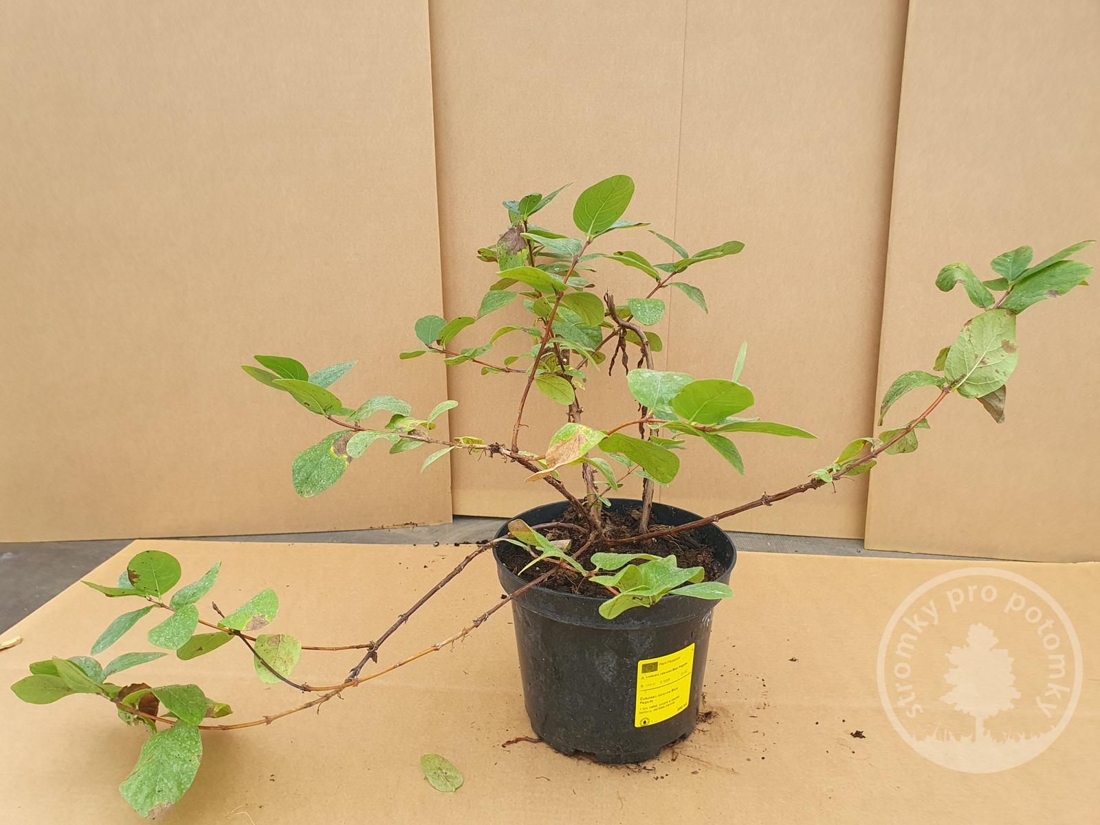 Tyto sazenice zimolezu kamčatského Blue Pagoda jsou prodávány v kontejneru o objemu 2 litry.
