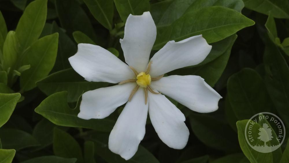Gardénie Pinwheel je výjimečně mrazuvzdorná, středně velký stálezelený keř s hustými, lesklými, tmavě zelenými listy a intenzivně vonnými bílými květy.