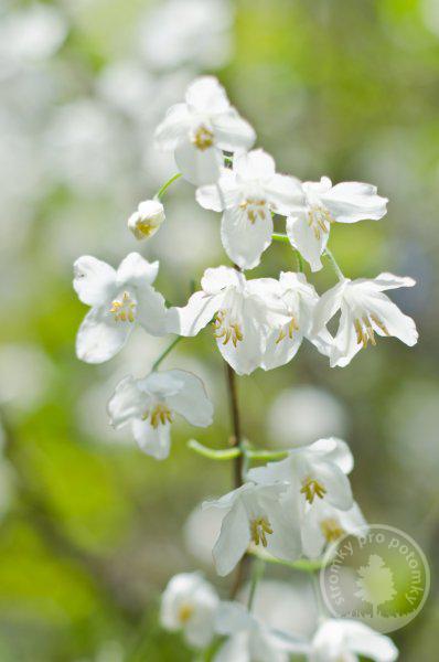 Krásně kvetoucí druh většího keře původem z USA s okrasnou pruhovitou mladou kůrou a zlatým zbarvením. Největším překvapením jsou ovšem cca 2cm velké bíle ,,sněženkovité,, květy, které zdobí během jara všechny výhony kěříku.