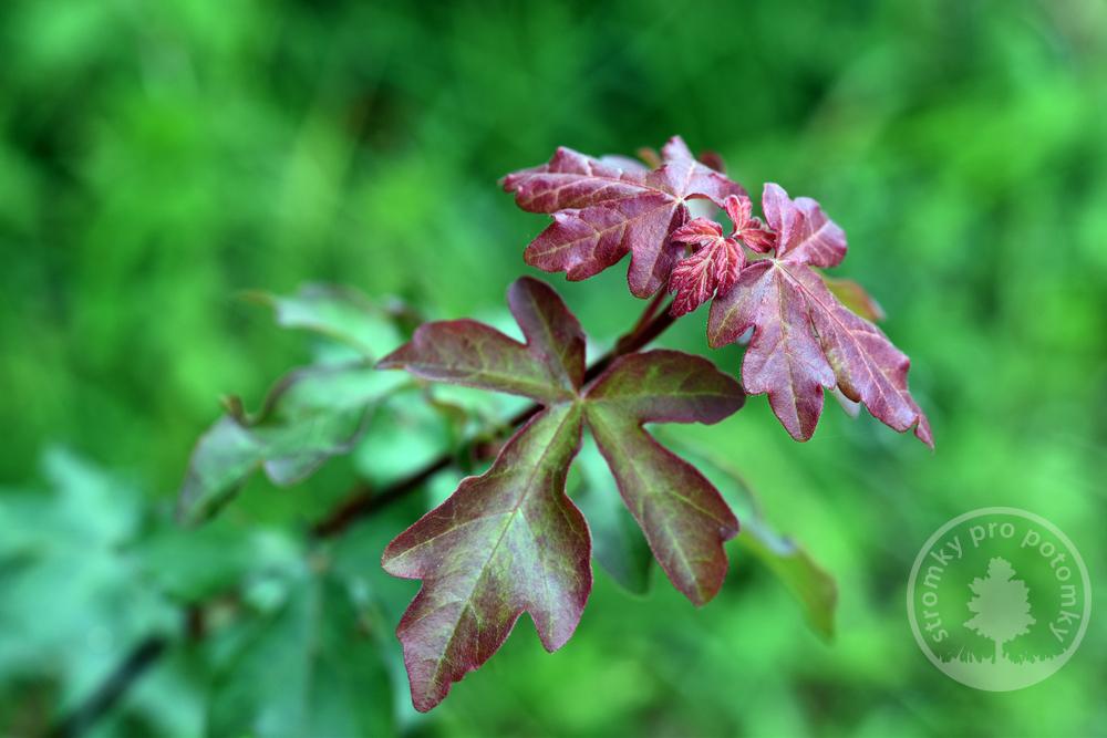 Méně bujný kultivar javoru babyky s výrazným vínově zbarvením mladých výhonů a listů.