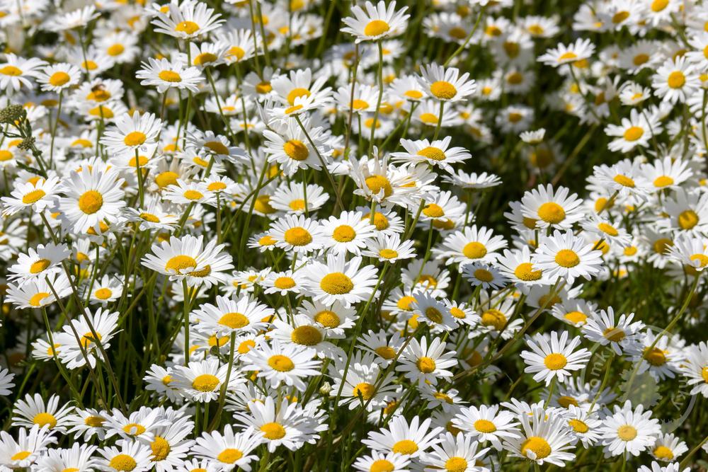 Kvete: jednoduchými, úborovitými, typickými, bílými květy s výrazným žlutým středem, květen až červenec