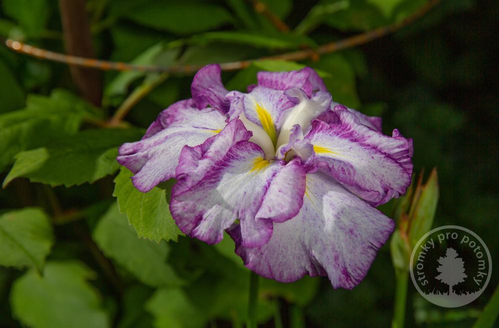 Kosatec s mimořádně velkým květem kolem 15 cm sněhobílé barvy s fialovým lemem.