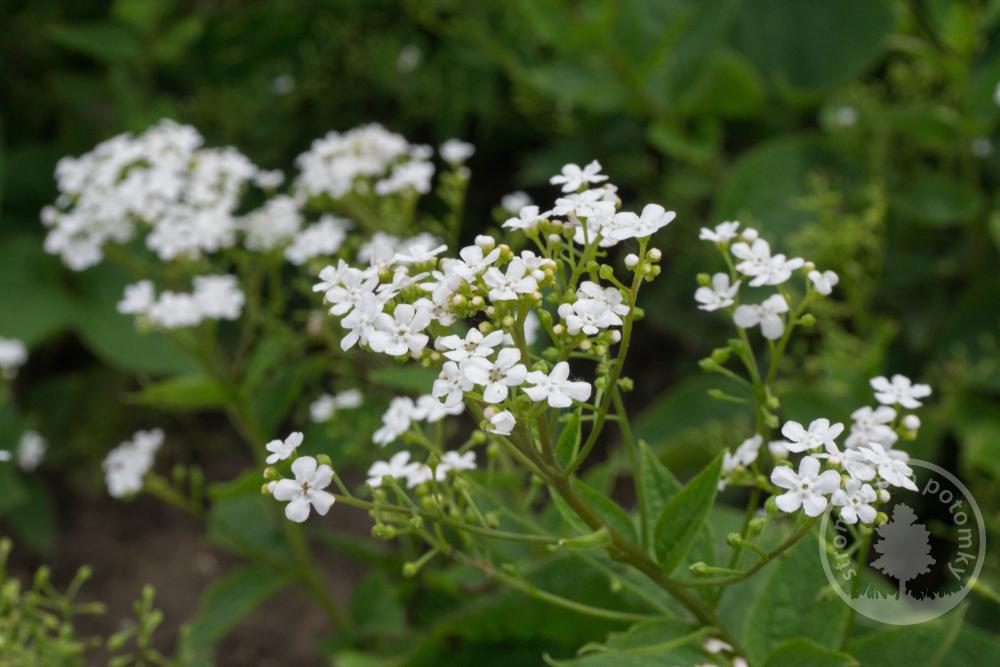 Bíle kvetoucí kultivar pomněnkovce s množstvím malých listů srdčitého tvaru a menšími pomněnku připomínajícími květy.