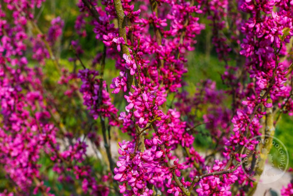 kvete: bohatě po celé rostlině (kauliflorie -květy na kmeni) před olistěním, zářivě růžovo fialovými květy, od konce dubna do května